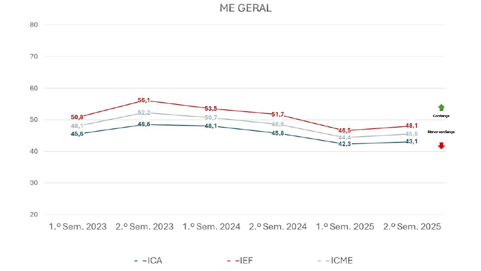 O ICME apresenta uma trajetória de variações moderadas ao longo dos últimos semestres, refletindo o impacto de fatores econômicos, políticos e setoriais sobre a confiança dos executivos de médias empresas. Entre o primeiro semestre de 2023 e o segundo semestre de 2025, o índice oscilou de 48,1 pontos para 45,5 pontos, refletindo ajustes diante de pressões fiscais, geopolíticas e da alta taxa de juros.