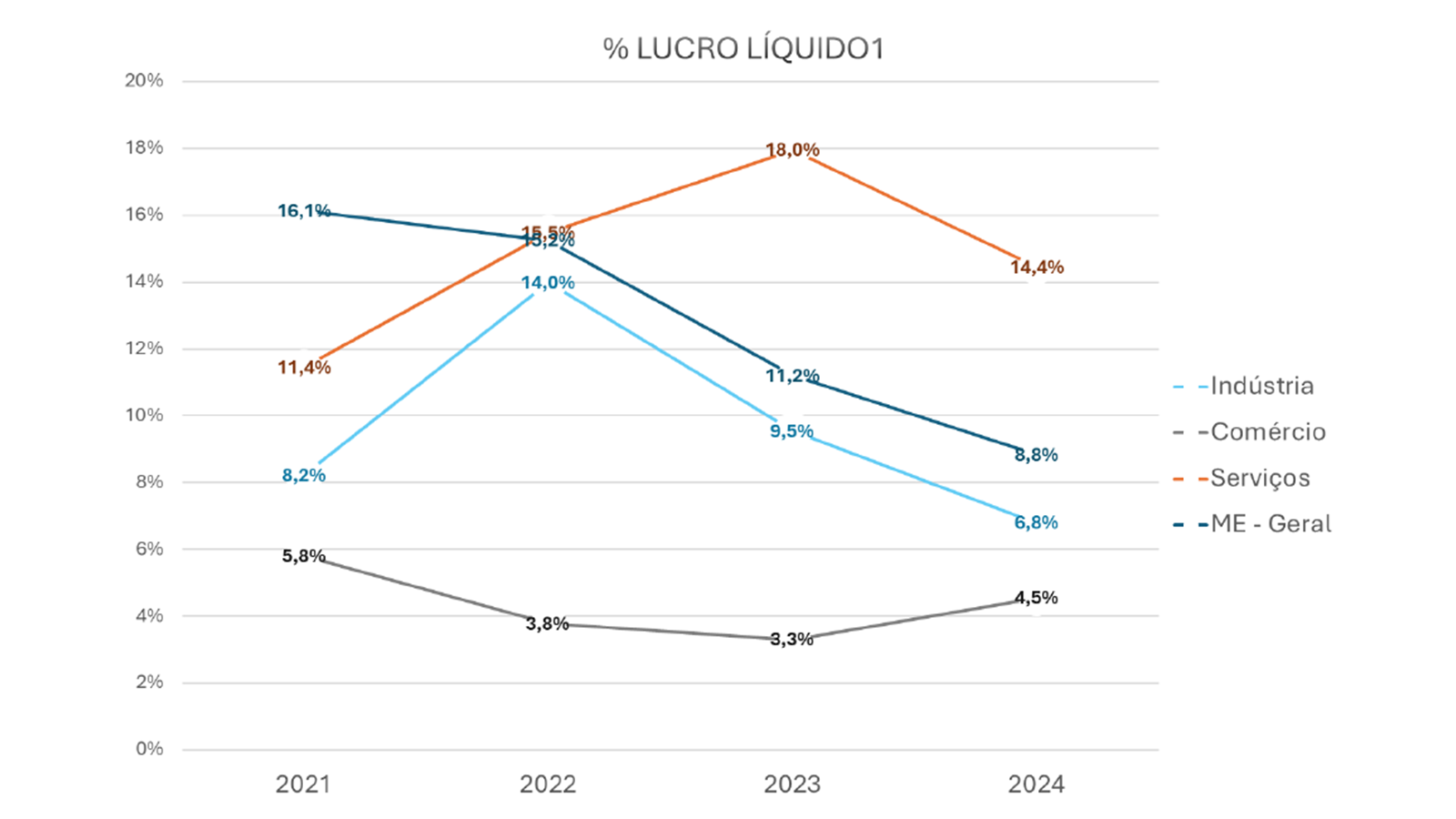 A margem de lucro líquido das médias empresas brasileiras (ME – Geral) apresentou trajetória descendente ao longo de 2021 a 2024. Após atingir 16,1% em 2021, houve uma redução para 15,2% em 2022, seguida de uma queda mais acentuada para 11,2% em 2023 e uma nova contração para 8,8% em 2024. A tendência indica um ambiente de pressão crescente sobre a rentabilidade final das empresas, o que pode se explicar devido a custos operacionais mais elevados e margens comprimidas, especialmente no último biênio.
